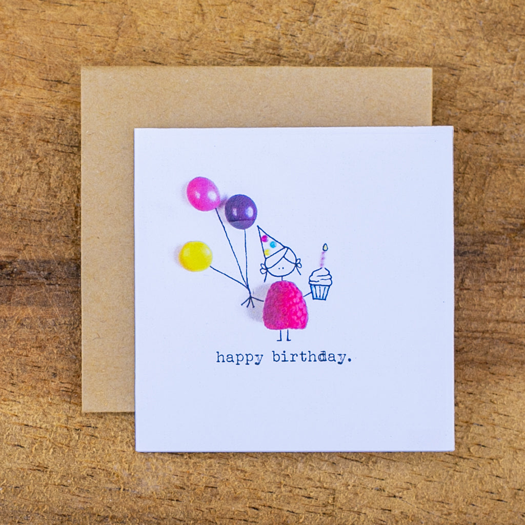 For Rawmona, it’s not a birthday without cake (or at least, a cupcake!) This card is designed with a raspberry + skittles laid on white paper, drew the rest using a black marker, and then photographed.