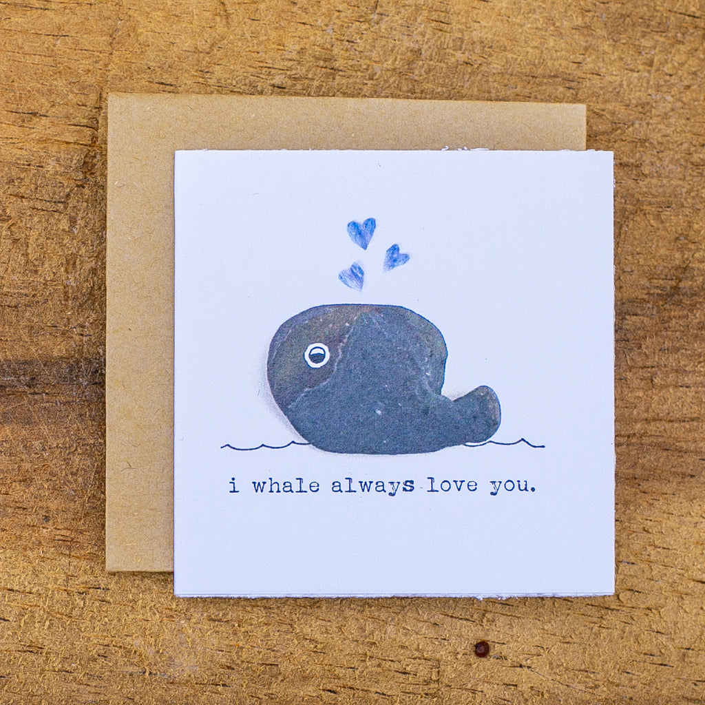 The “I Whale Always Love You” card was created using a rock (yes, a rock!) my friend found on the beach + blue flower petals.